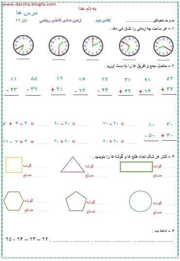 به نام خداوند علم و قلم در این وبلاگ سعی شده است نمونه سوالات امتحانی- تکالیف هفتگی (آدینه)- آزمون های عملکردی - چک لیست دروس - مطالب علمی و آموزشی - مطالب بهداشتی - و در مجموع مطالب مربوط به آموزش ابتدایی و مطالب خواندنی دیگر گنجانده شود که امیدوارم مورد توجه دوستان بازدیدکنندگان قرار گیرد قرار گیرد.