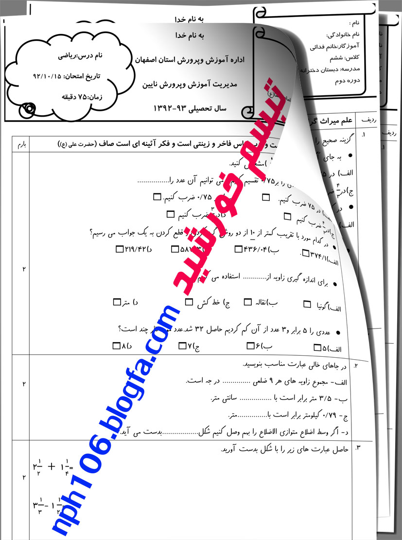 نمونه سوال ریاضی ششم نوبت دوم خرداد 92